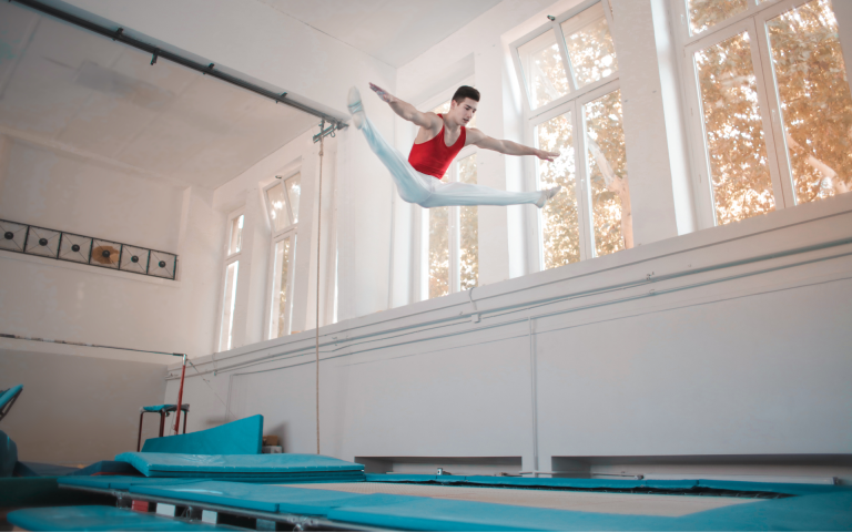 トランポリンは空中でのアクロバティックな演技で、美しさ・難易度・高さ・移動距離を競う採点競技です。選手には卓抜したバランス感覚と運動能力が求められます。